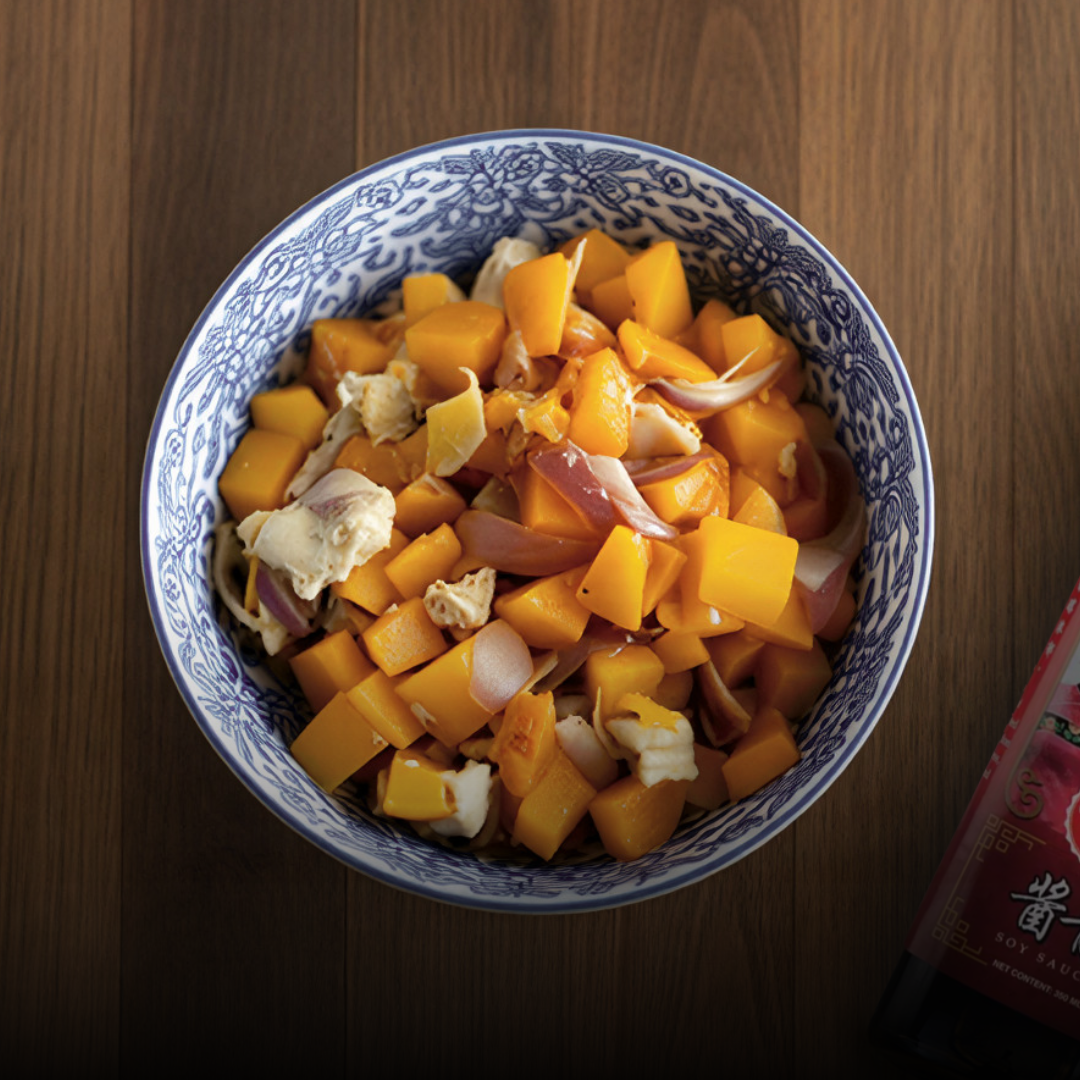 - Add the sliced pork and cook until it changes color. Then, add the pumpkin chunks and mix well.