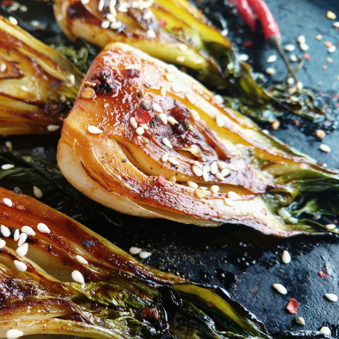 5. Drizzle the sauce over the bok choy. Garnish with red chili, spring onion, and sesame seeds. Ready to serve.
